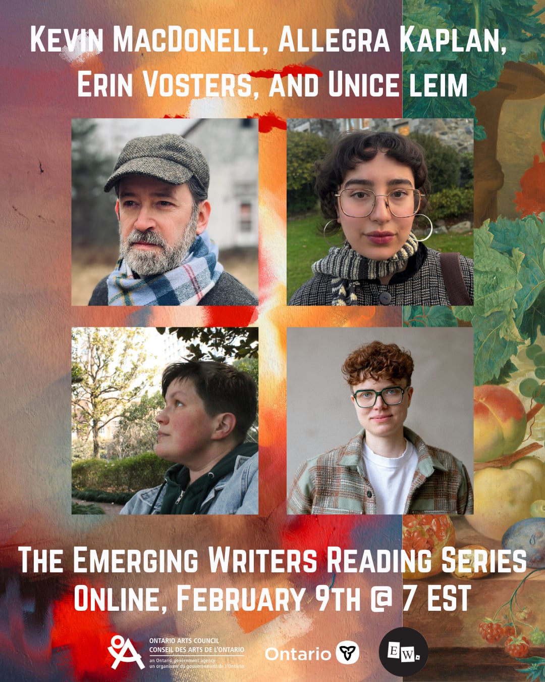 Our next event will be online on January 8th, 2024 at 7pm EST! This event will include readings from Iryn Tushabe, Paula Turcotte, Catherine St. Denis, and Kathy Mak as well as a conversation with literary editor Ryanne Kap from Ex-Puritan Magazine.